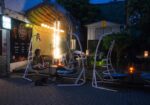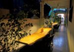 Dining can be enjoyed in a peaceful outdoor courtyard surrounded by greenery, perfect for a relaxing meal