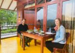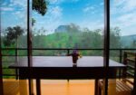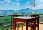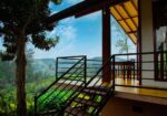 Each guestroom includes air-conditioning and private balconies with views of lush green mountains.