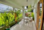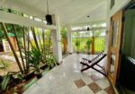The guest house is surrounded by tropical plants.