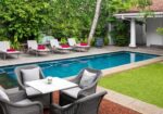 Guests can relax by the outdoor swimming pool while enjoying snacks or drinks